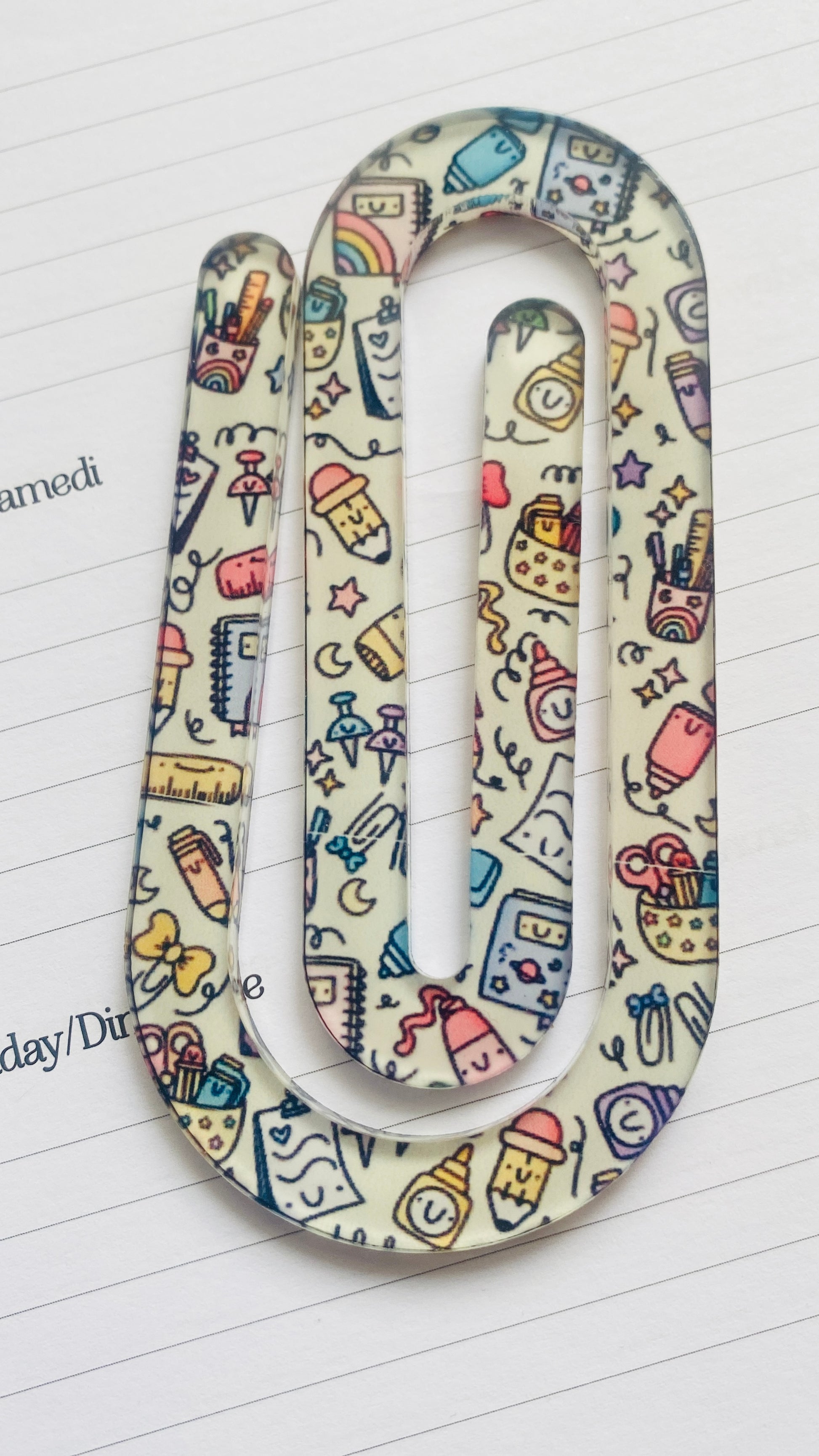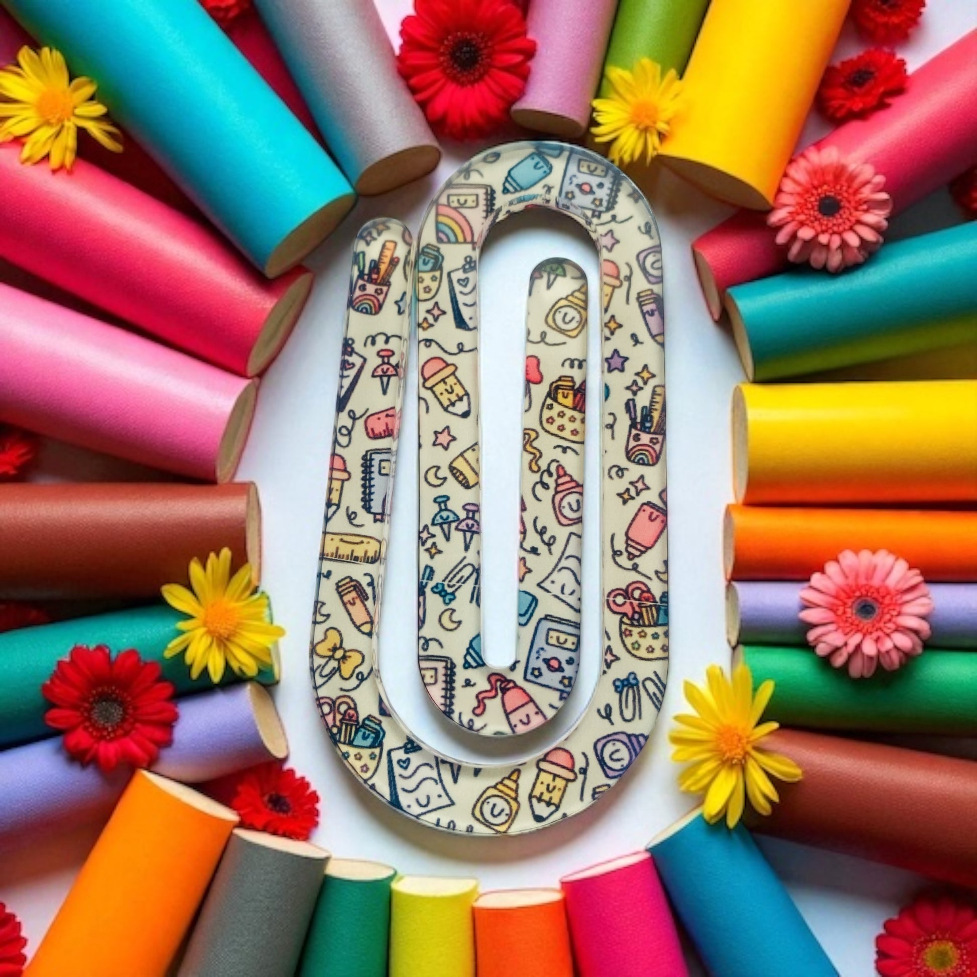 Bring a splash of creativity to your reading and journaling with this sublimated paper clip bookmark! Featuring a vibrant arts-and-crafts-inspired pattern of doodles—like paintbrushes, pencils, and cute craft supplies this paper clip is both practical and playful. Perfect for artists, crafters, students, or anyone who loves to add a bit of color to their books, notebooks, or journals.