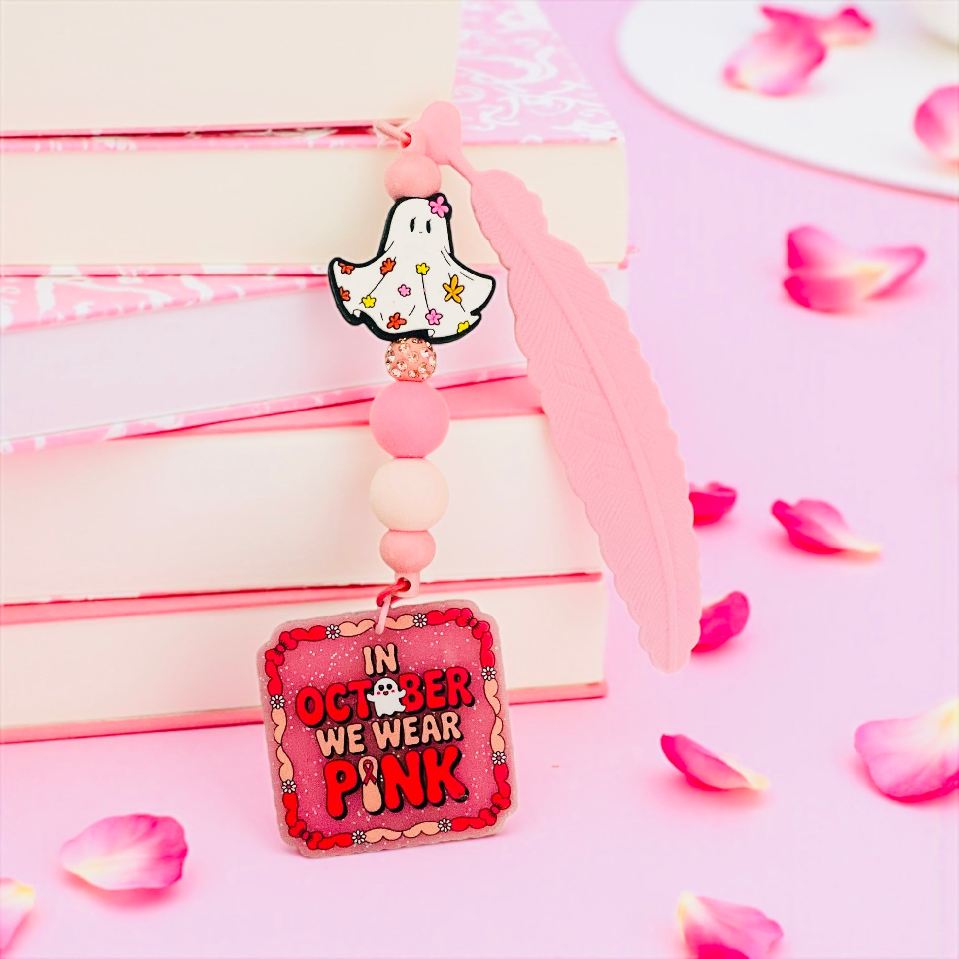 Cute Ghost Charm Bookmark, Beaded, pink Beaded, Book lover, Bookish merch, Floral Ghost, Breast Cancer Awareness, Pink October, Floral ghost, flower bookmark